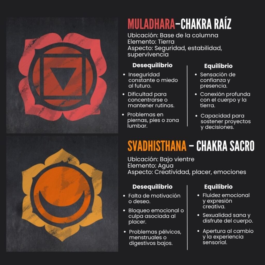 - Posturas de enraizamiento (como Tadasana o Virabhadrasana II) fortalecen el chakra raíz.