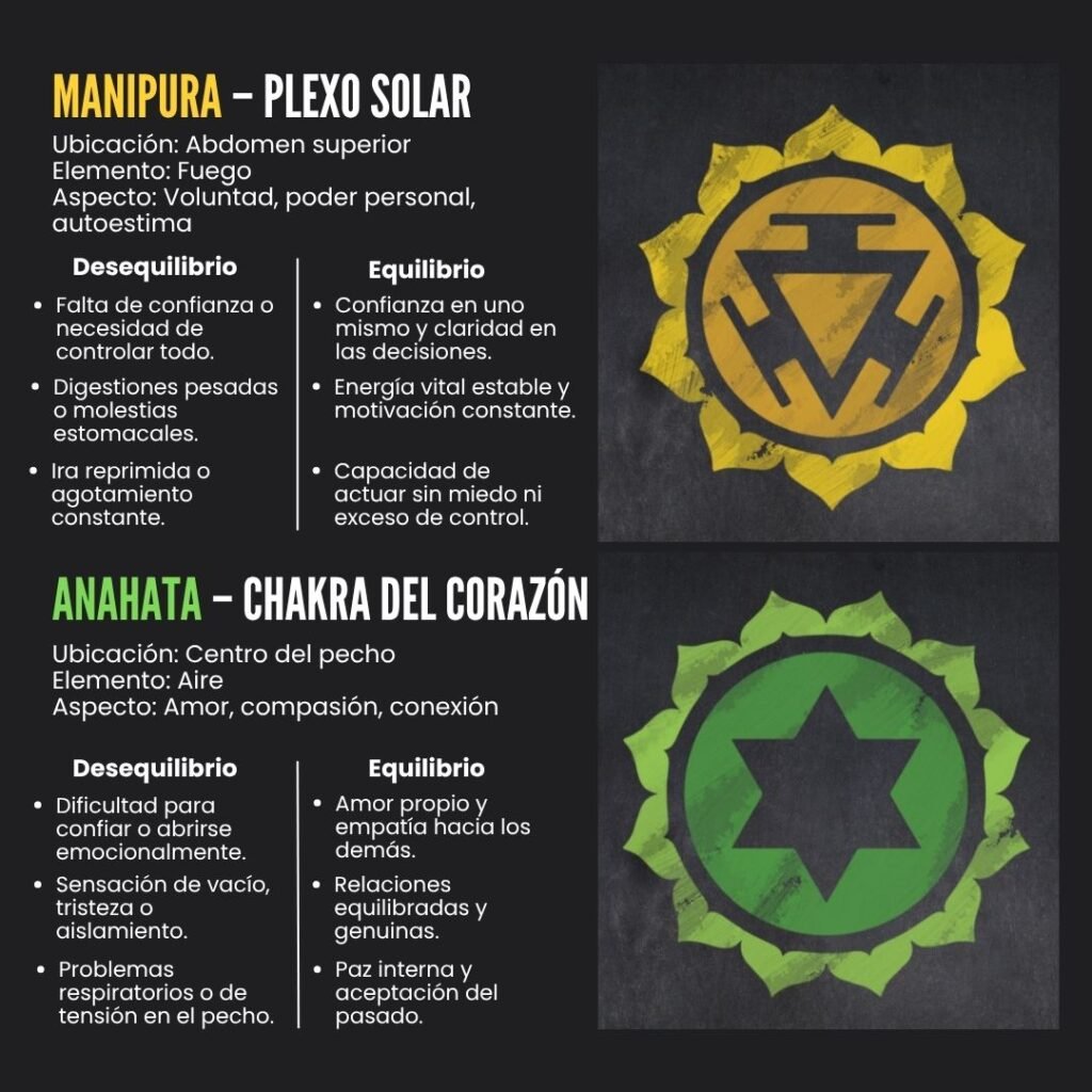 Cada chakra influye en zonas específicas del cuerpo, en emociones particulares y en aspectos simbólicos de nuestra vida: seguridad, creatividad, confianza, amor, comunicación, intuición y consciencia.