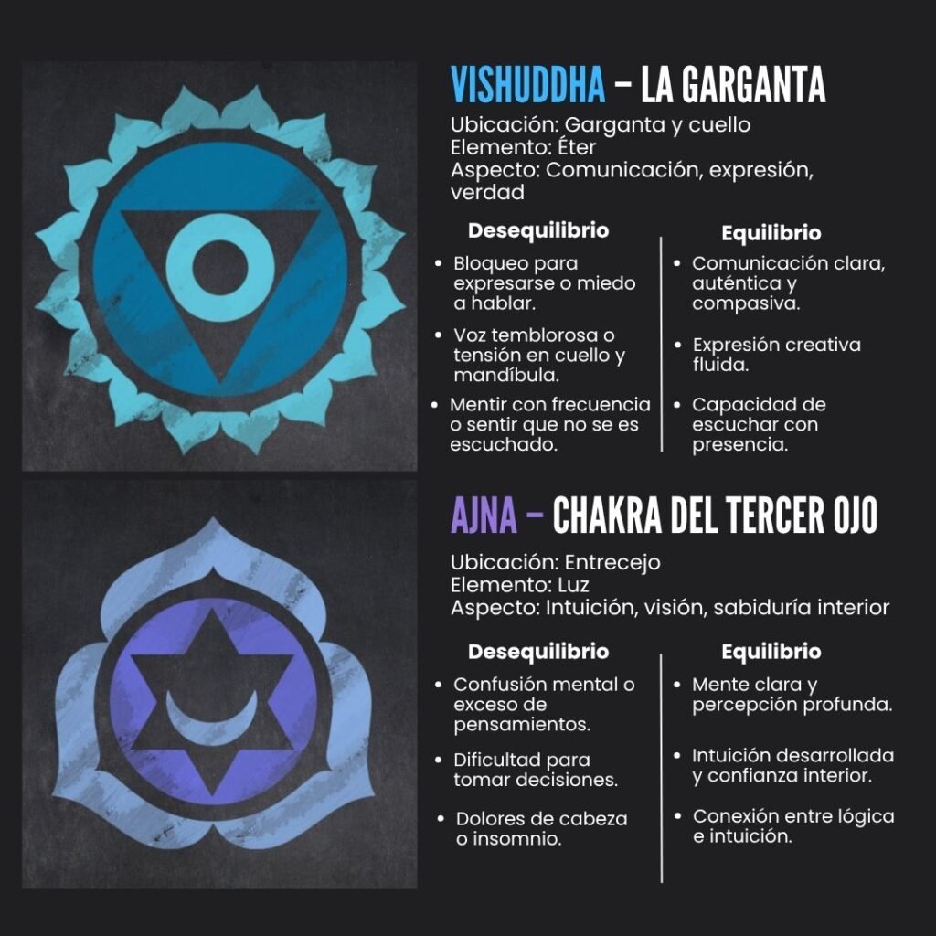 Por otro lado si alguno, varios o todos están bloqueados (por no expresarte, por estrés, malos hábitos, sobre pensar, etc) esto se reflejara directamente en tu cuerpo, mente y energía, se potenciara la tensión, el cansancio, la irritabilidad, desmotivación, etc.